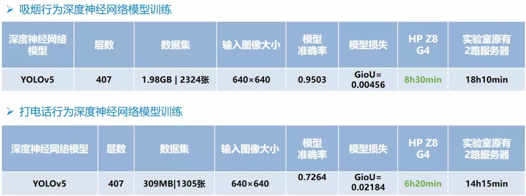 首先使用目标检测领域最著名深度学习模型 YOLO 分别对吸烟行为和打电话行为进行训练。通过测试,我们看到使用 HP Z8 G4 能够明显提高训练速度,节省大量时间。