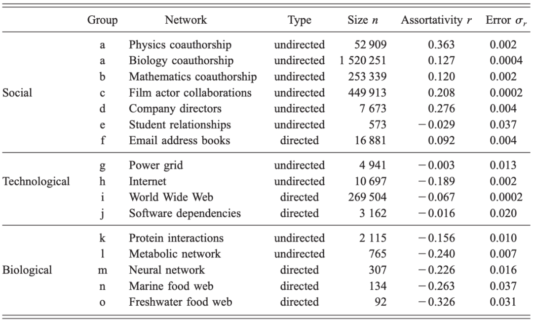 但是,我们不禁要问,现实世界中的网络是否都具有同配性这一特点呢?其实早在2003年,密歇根大学的物理学教授Mark Newman就已经在论文《Mixing patterns in networks》[4] 中对现实世界里的各种网络的同配性做了分析,如下图所示: