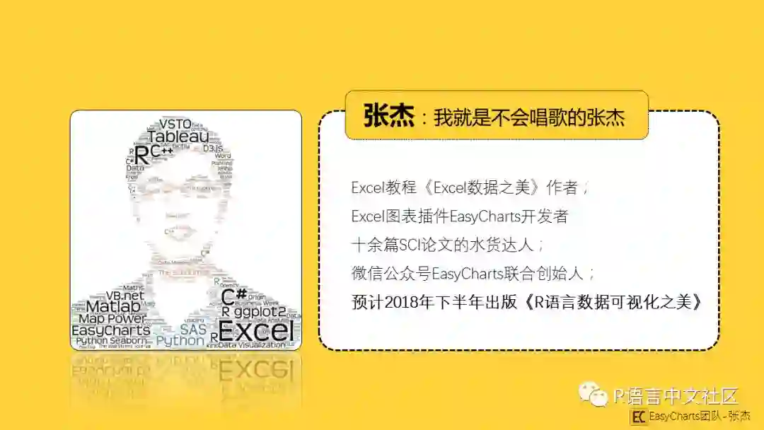 张杰 香港理工大学助理研究员,Excel教程《Excel数据之美》作者;Excel图表插件EasyCharts开发者,十余篇SCI论文的水货达人;微信公众号EasyCharts联合创始人;预计 2018 年 下半年 出版 《R语言数据可视化之美 》。