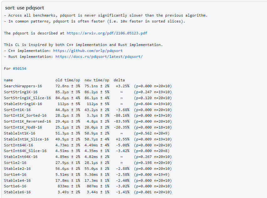 目前,Go 仓库的最新 commit 中介绍了 pdqsort 的相关功能描述: