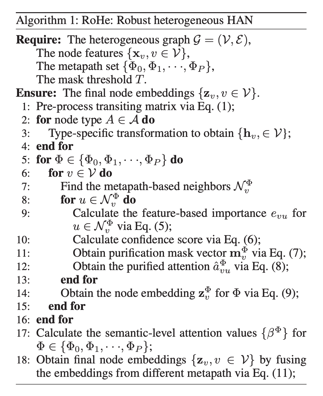 为了减少扰动的放大效应,RoHe 引入了一个转移概率作为我们的净化器的先验,降低对抗 hub 邻居的置信度。然后,基于转移概率和特征相似性对感受域进行收缩,mask 掉置信度很低的邻居,解决了软注意力机制不能彻底消除对抗边的问题。最后,利用净化后的注意力聚合所有元路径的邻居信息,将这些元路径进行语义级聚合,最终生成下游任务的节点嵌入。图 2 是 RoHe 的整体框架。