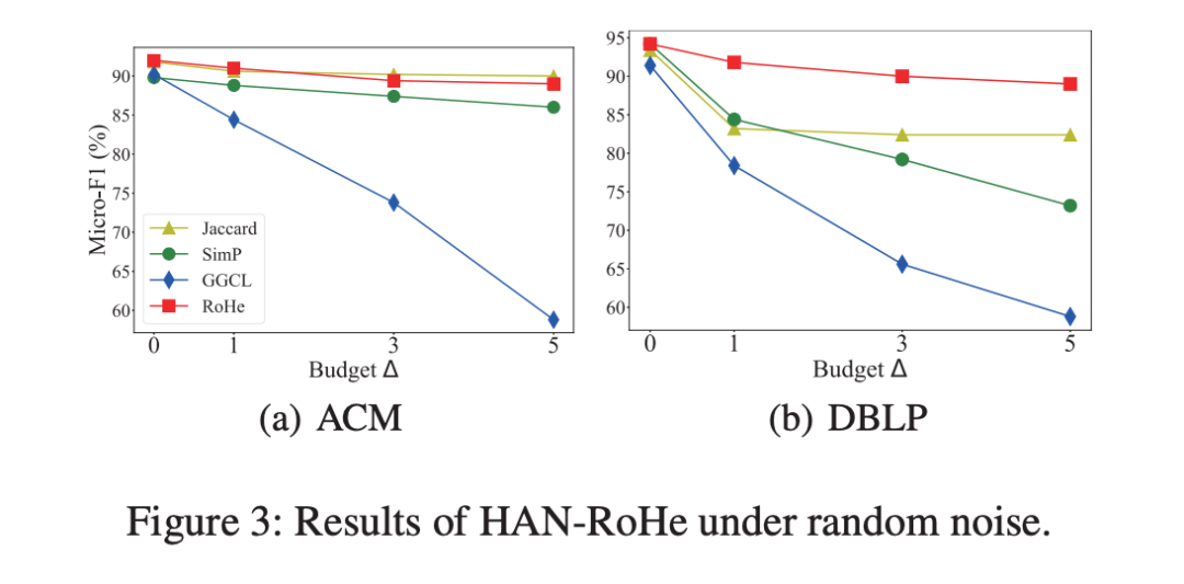 RoHe 在 HAN 上的对抗防御效果实验:在三个数据集上的不同程度的攻击实验证明了 RoHe 的防御能力。其中 Δ 含义是对抗攻击的边数。