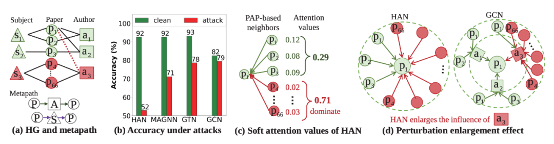 如图 1a 所示,一个对抗攻击的例子是在原有的异质图中添加一条不存在的边 (p1, a3, 红色虚线),这将会导致恶意的论文结点 p4-p66 在元路径 P-A-P 下成为 p1 的直接邻居。即使它们被分配了较小的注意值,它们仍然可以主导 HAN 中的接受域。