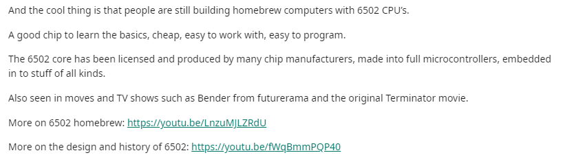 6502绝对是一个学习芯片基础知识的绝佳之选!它价格便宜、易于使用、易于编程,6502内核已被许多芯片制造商许可和生产,制成了完整的微控制器,并嵌入到各种电子设备中。