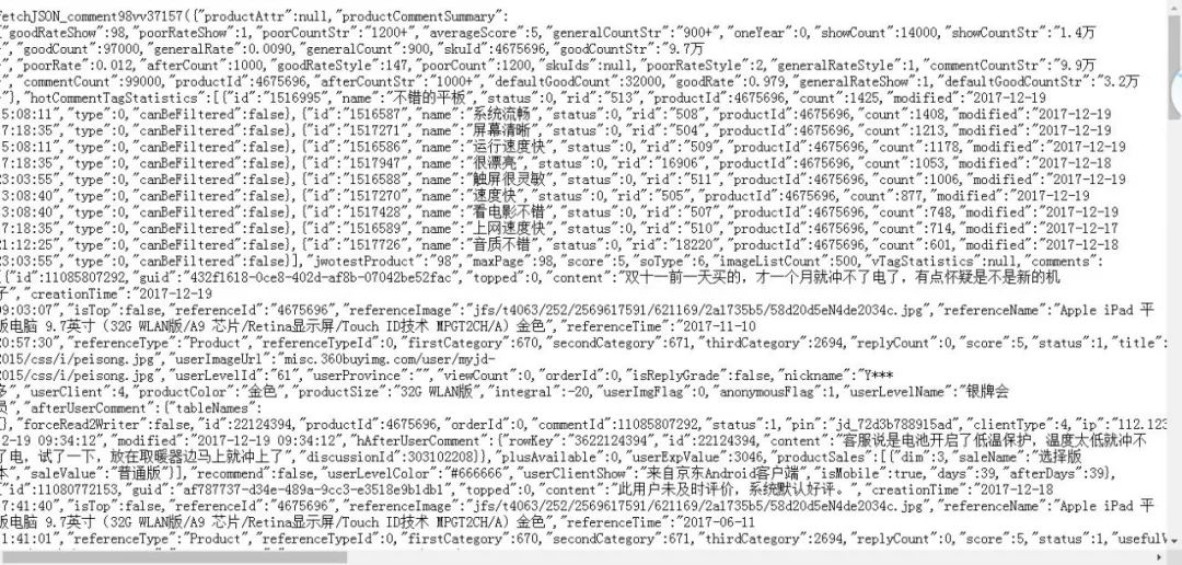 仔细查看调试台可以很容易地发现商品的评论信息都是用json来传递的。如下:https://club.jd.com/comment/productPageComments.action?callback=fetchJSON_comment98vv37157&productId=4675696&score=5&sortType=6&page=0&pageSize=10&isShadowSku=0&fold=1