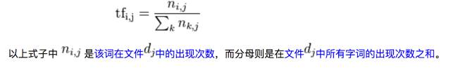 在一份给定的文件里,词频(term frequency,TF)指的是某一个给定的词语在该文件中出现的频率。这个数字是对词数(term count)的归一化,以防止它偏向长的文件。(同一个词语在长文件里可能会比短文件有更高的词数,而不管该词语重要与否。)对于在某一特定文件里的词语 来说,它的重要性可表示为: