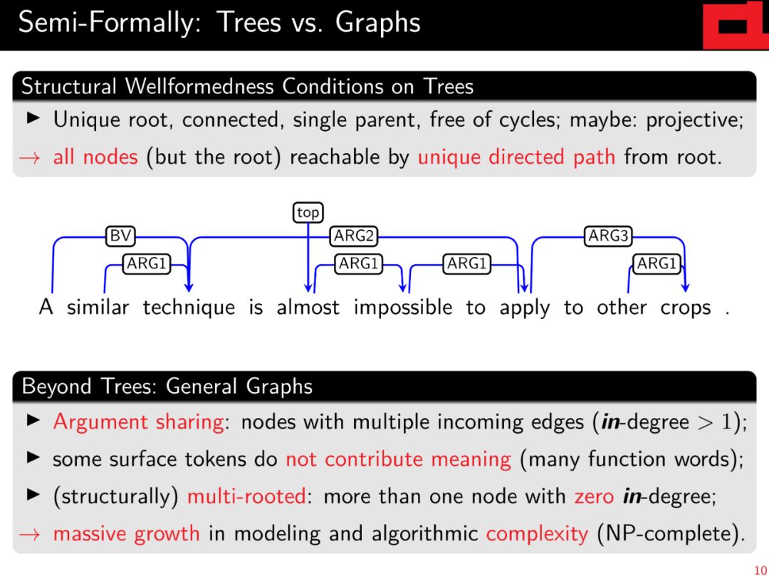 近年来,人们对以有向图的形式编码和处理句子意思的方法产生了广泛的兴趣。这一研究方向的框架包括:抽象含义表征(Abstract Meaning Representation)、基于图的最小递归语义呈现(graph-based rendering of Minimal Recursion Semantics)、双向语义依赖图(Bilexical Semantic Dependency Graphs)和通用感知认知标注(Universal Conceptual Cognitive Annotation)。