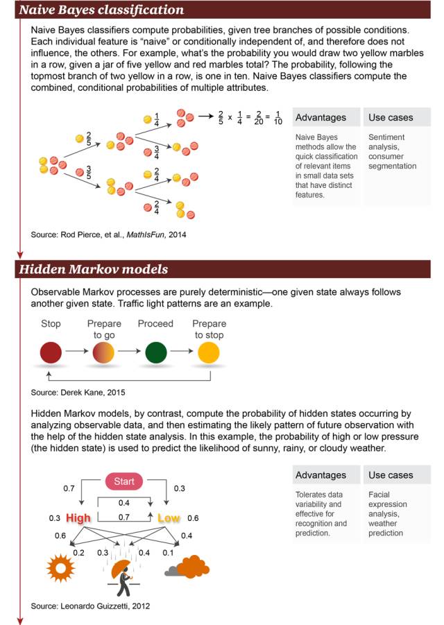 4. 朴素贝叶斯分类(Naive Bayes Classification):朴素贝叶斯分类器用于计算可能条件的分支概率。每个独立的特征都是「朴素」或条件独立的,因此它们不会影响别的对象。例如,在一个装有共 5 个黄色和红色小球的罐子里,连续拿到两个黄色小球的概率是多少?从图中最上方分支可见,前后抓取两个黄色小球的概率为 1/10。朴素贝叶斯分类器可以计算多个特征的联合条件概率。