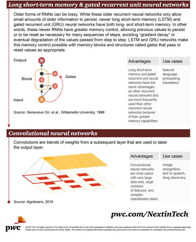 8. 长短期记忆(Long short-term memory,LSTM)与门控循环单元神经网络(gated recurrent unit nerual network):早期的 RNN 形式是会存在损耗的。尽管这些早期循环神经网络只允许留存少量的早期信息,新近的长短期记忆(LSTM)与门控循环单元(GRU)神经网络都有长期与短期的记忆。换句话说,这些新近的 RNN 拥有更好的控制记忆的能力,允许保留早先的值或是当有必要处理很多系列步骤时重置这些值,这避免了「梯度衰减」或逐层传递的值的最终 degradation。LSTM 与 GRU 网络使得我们可以使用被称为「门(gate)」的记忆模块或结构来控制记忆,这种门可以在合适的时候传递或重置值。