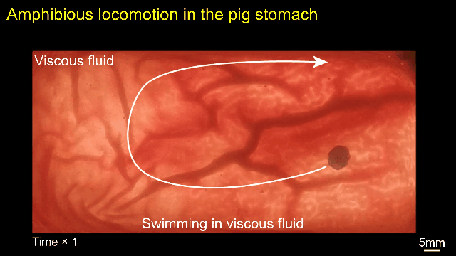 而且,新型毫米级折纸机器人无论是在水上、水面和水下,还是在充满粘液的猪胃内,都可以正常工作。