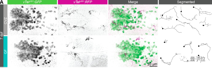 此外,相比对照组,无菌处理过的斑马鱼vTely321神经突触表现出更深度「树枝化」特点。且该过程持续到了其幼年发育晚期。