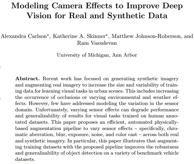 最近,我们的研究主要集中于生成合成图像和增强真实图像,以增加用于学习城市场景中视觉任务的训练数据的大小和可变性。这包括增加遮挡的发生或改变环境和天气的影响。然而,几乎没有人能够解决传感器领域中的变分建模问题。不幸的是,对于在人工注释的数据集上进行训练的视觉任务而言,改变传感器效应会降低其性能和结果的泛化能力。本文提出了一种高效、自动化的基于物理的增强管道,以改变真实的和合成图像上的传感器的效应——特别是色差、模糊、曝光、噪音和偏色等。具体来说,本文阐述了,使用所提出的管道增加训练数据集,能够提高在各种基准工具数据集上目标检测的鲁棒性和可泛化性。