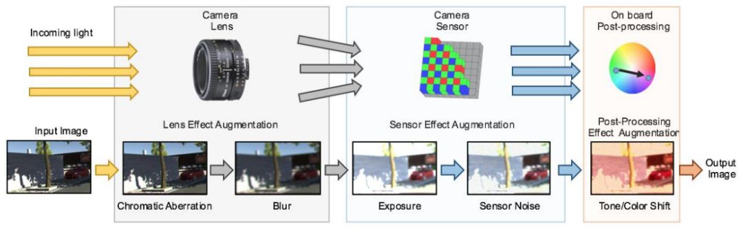 图2:在我们的研究中所使用的图像形成和处理流程图。一个给定的图像会经历增强,这些增强就近似于相机在图像中所产生的相同像素级效果。