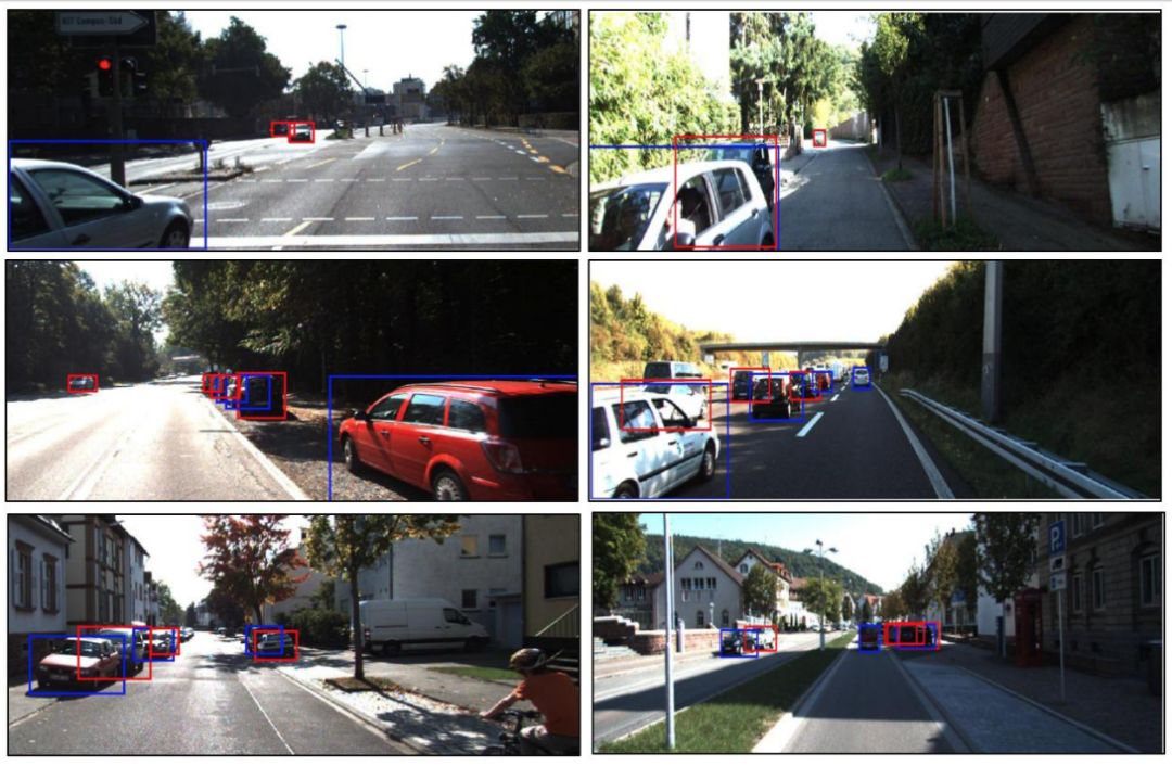 图1:在KITTI上对基线未增强数据(左)和我们提出的方法(右)进行目标检测的样本示例。蓝色方框表示正确的检测结果,红色方框表示基线法遗漏的、但通过我们所提出的基于传感器的图像增强方法能够检测到的结果。