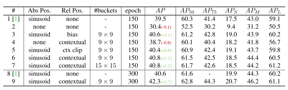本文作者回顾了现有的相对位置编码方法,并提出了四种专门用于视觉Transformer的方法。作者通过实验证明了通过加入相对位置编码,与baseline模型相比,在检测和分类任务上都有比较大的性能提升。此外,作者通过对不同位置编码方式的比较和分析,得出了下面几个结论: