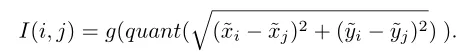 在上述的Euclidean method中,具有不同相对距离的两个距离可能映射到同一距离下标(比如二维相对位置(1,0)和(1,1)都映射到距离下标1中)。因此,作者提出Quantization method,如上图b所示,公式如下所示: