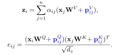 除了每个输入token的绝对位置之外,一些研究人员还考虑了token之间的相对关系。相对位置编码使得Transformer能够学习token之间的相对位置关系,用公式表示如下:
