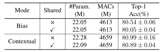对于bias模式,在head上共享编码时,准确度会显著下降。相比之下,在contextual模式中,两种方案之间的性能差距可以忽略不计。