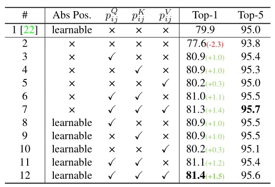 通过仅在key上添加相对位置编码,将DeiT-Ti/DeiT-S/DeiT-B模型分别提升了1.5%/1.0%/0.6%的性能。