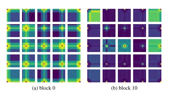 4)相对位置编码迫使浅层的layer更加关注局部的patch。