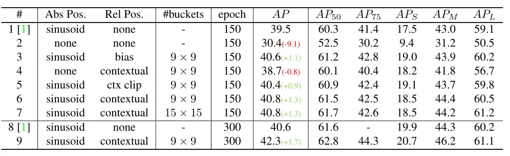 在DETR中绝对位置嵌入优于相对位置嵌入,这与分类中的结果相反。作者推测DETR需要绝对位置编码的先验知识来定位目标。