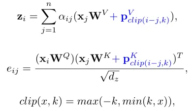 [1]提出一种Self-Attention的相对位置编码方法。输入token被建模为一个有向全连通图。每条边都代表两个位置之间的相对位置信息。此外,作者认为精确的相对位置信息在一定距离之外是无用的,因此引入了clip函数来减少参数量,公式表示如下: