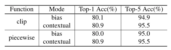 上表比较了clip函数和分段函数的影响,在图像分类任务中,这两个函数之间的性能差距非常小,甚至可以忽略不计。但是从下表中可以看出,在检测任务中,两个函数性能还是有明显差距的。
