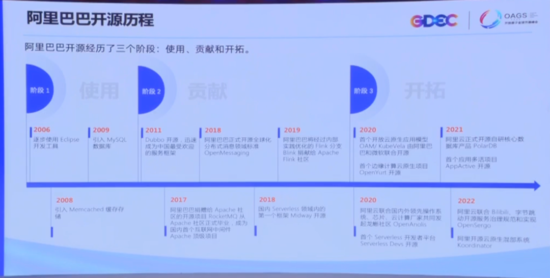 回顾过去,阿里巴巴的开源经历了三个过程,从使用到贡献到现在正在进入开拓阶段。阿里巴巴在创业的早期就大量地使用开源软件,阿里技术的发展也植根在开源的沃土中,我们也非常感谢开源社区的帮助。当我们具备了一定的能力,尤其是在大规模互联网系统和云类研发中开始积累了很多经验,也解决了很多新的问题的时候,阿里巴巴也开始积极地将自己的实践以开源软件的形态回馈给社区,如 Dubbo、RocketMQ、Flink、Midway 等一系列的开源软件。这些软件我们坚持做了十多年,到现在还在维护,阿里也会努力地继续维护下去。