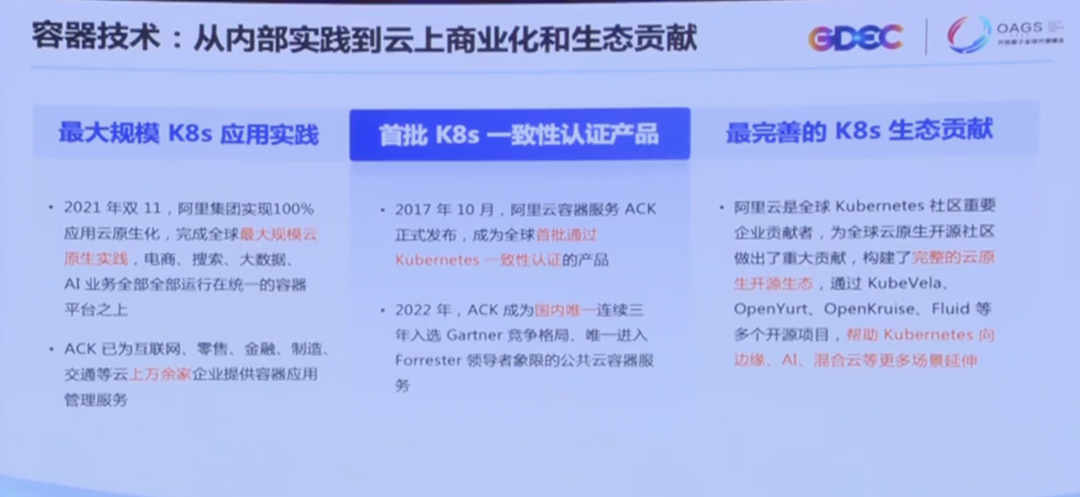 第三个案例是龙蜥操作系统。容器操作系统被定位是面向下一代、面向云的一个开源操作系统,借助阿里和云上客户的不断打磨和优化,目前已是一个非常成熟的开源社区。我们认为借助基于云+开源来支撑的数字化进程,这一确定性的趋势,以“三位一体”开源的模式去继续发展操作系统,能够让我们在云时代,不但能够补上基础软件领域的短板,而且有机会去实现跨越式的发展。