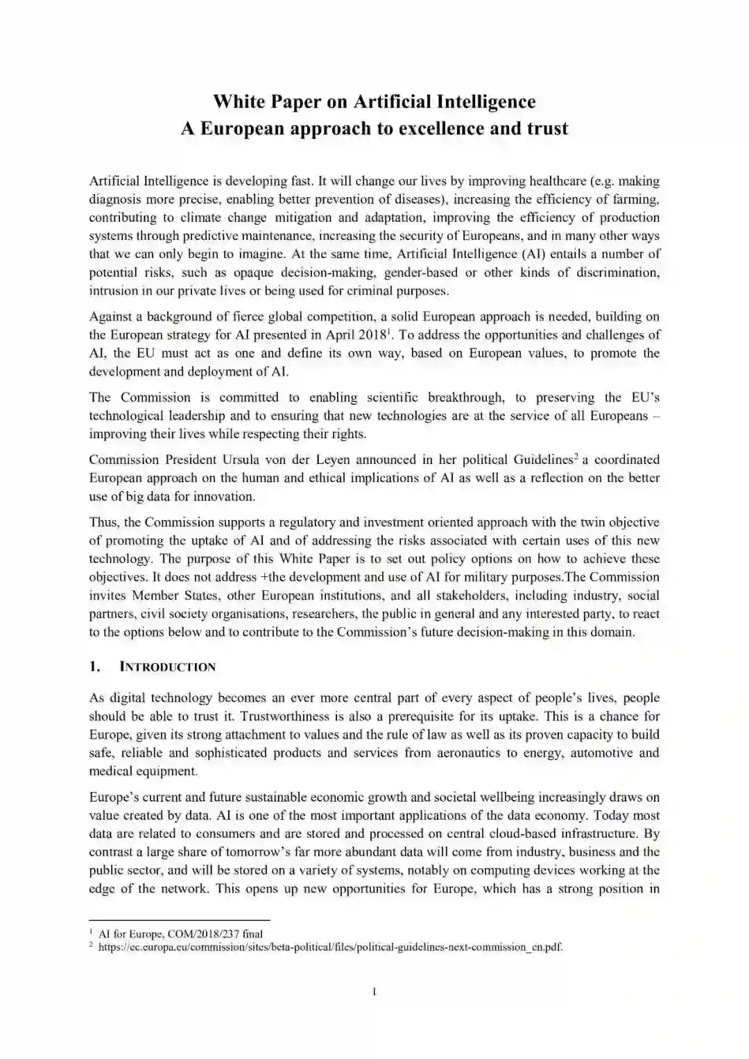 白皮书指出,人工智能 (AI) 是一项战略性技术,有益于社会、公司和个人。AI以人为本,基于道德,可持续发展,尊重最基本的权利和价值。AI带来的效率和生产率不仅能够提升欧洲的产业竞争力,提升人们的生活福祉,还能够有效应对气候变化、环境退化、人口变化、民主权益、社会犯罪等一些急迫解决的社会问题。
