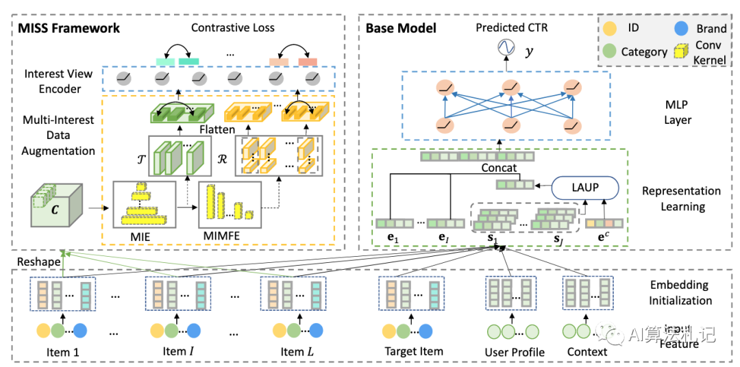 为了解决这些具有挑战性的问题,我们提出了一种新颖的多兴趣自监督学习(MISS,Multi-Interest Self-Supervised learning)框架,该框架通过兴趣级别的自监督信号增强了特征嵌入。在两个新的基于 CNN 的多兴趣提取器的帮助下,在充分考虑不同兴趣表示(逐点和联合)、兴趣依赖(短期和长期)以及兴趣相关性(项目间和项目内)下获取自监督信号。在此基础上,将对比学习损失进一步应用于兴趣表示的增强视图,有效地改进了特征表示学习。此外,我们提出的 MISS 框架可以用作现有点击率预估模型的“插件”组件,并进一步提高其性能。在三个大规模数据集上的大量实验表明,MISS 显著优于最先进的模型,AUC 高达 13.55%,并且与代表性的深度点击率预估模型具有良好的兼容性。