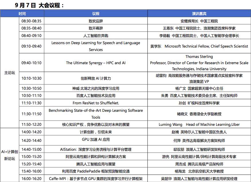 在主论坛上,权威专家将聚焦AI计算趋势研讨,包括中国工程院王恩东院士、李德毅院士、微软技术院士黄学东、集群超算架构创始人Thomas Sterling、浪潮副总裁胡雷钧、国家超算无锡中心主任杨广文、百度人工智能技术委员会主席朱勇、旷视科技首席科学家孙剑、深度学习框架评测专家褚晓文、Uber机器学习主任王鲁明等业界专家,将带来人工智能计算与应用的精彩前沿报告。