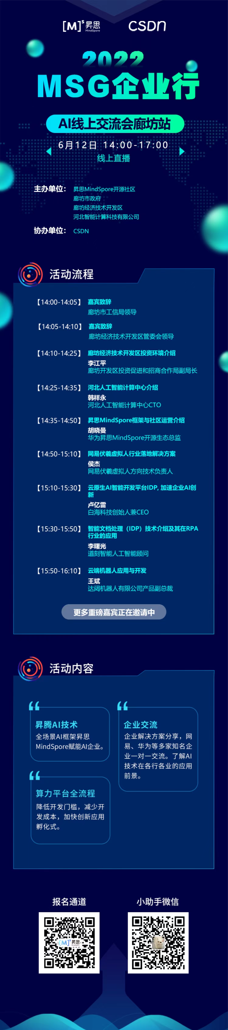 2022年6月12日(周日),昇思MindSpore开源社区联合廊坊工信局、廊坊开发区、河北人工智能计算中心共同举办【MSG企业行·廊坊站】线上交流会。