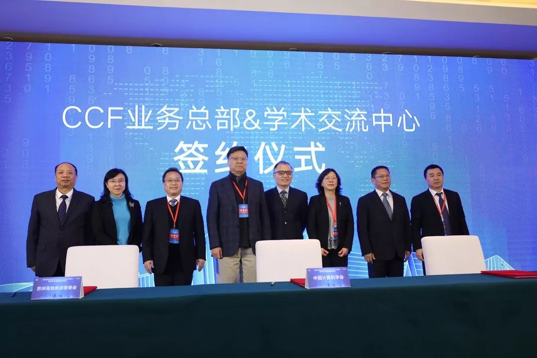 2019年1月12日,中国计算机学会(CCF)与苏州市相城区人民政府、苏州高铁新城管委会在苏州高铁金科大酒店联合举办了CCF业务总部&学术交流中心落地苏州相城签约仪式及新闻发布会,CCF理事长高文,秘书长杜子德,前任副理事长、中国工程院副院长陈左宁等CCF常务理事、理事、执行机构负责人、周边城市会员活动中心和YOCSEF城市分论坛有关负责人、秘书处部分骨干;苏州市人民政府副秘书长卢渊、苏州市科协主席程波;相城区委书记顾海东,相城区委常委、常务副区长潘春华,相城区委常委、苏州高铁新城党工委书记苏学庆以及新华社、中新社、江苏电视台、新华日报、苏州电视台、苏州日报等媒体记者,共计200多人出席了本次会议。签约仪式由相城区副区长朱小海主持。