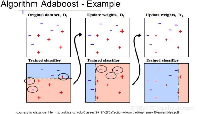 AdaBoost是用于短决策树的,在创建第一个树后,通过每个训练实例上的树的性能来衡量下一个创建的树对每个训练实例分配的权重。难以预测的训练数据将获得更多的权重。