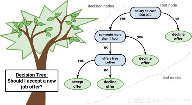 树的叶节点包含用于预测的输出变量(y),预测从树干开始遍历,直到到达叶节点并输出叶节点的值。树的学习速度和预测速度都非常快,并且不需要对数据进行任何的准备。