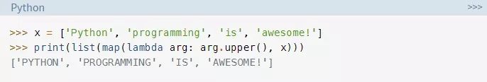 for循环的结果与map()示例相同,后者中收集了所有项的大写形式。但是,与filter()示例一样,map()会返回一个iterable,这再次使得它可以处理无法完全装入内存的大数据集。