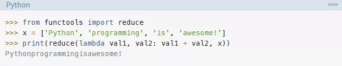 这段代码会将iterable中的所有项(从左到右)组合成一个单独的项。这里没有调用list(),因为reduce()已经返回了一个单独项目。