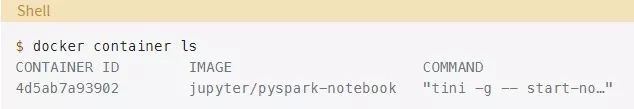 这个命令将显示所有正在运行的容器。找到运行jupyter/pyspark-notebook镜像的容器的CONTAINER ID,并使用它连接到容器内的bash shell: