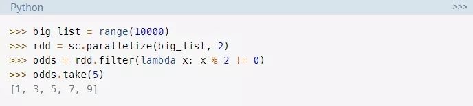 为了更好地理解RDDs,我们考虑另一个例子。下面的代码会创建一个包含10,000个元素的迭代器,然后使用parallelize()将数据分布到2个分区中: