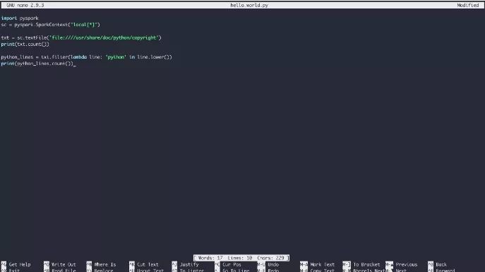 要使用正在运行的Docker容器运行Hello World示例(或任何PySpark程序),首先,你得像前边描述的那样访问shell。一旦进入容器的shell环境,你就可以使用nano文本编辑器创建文件。