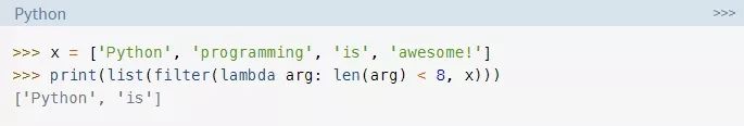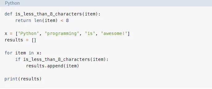 这段代码会收集所有少于8个字符的字符串。代码比filter()示例更冗长,但是它执行的是相同的函数,得到是相同的结果。