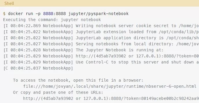 现在你有一个容器来运行PySpark了。注意,docker run命令输出的末尾提到了一个本地URL。