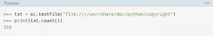 创建RDDs的另一种方法是使用textFile()读入一个文件,你在前面的示例中已经看到了该方法。RDDs是使用PySpark的基本数据结构之一,因此API中的许多函数都会返回RDDs。