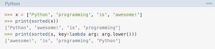 sorted函数的key参数会被调用来获取iteranle(迭代)中的每个项。这使得排序不区分大小写,方法是在排序之前将所有字符串变为小写。