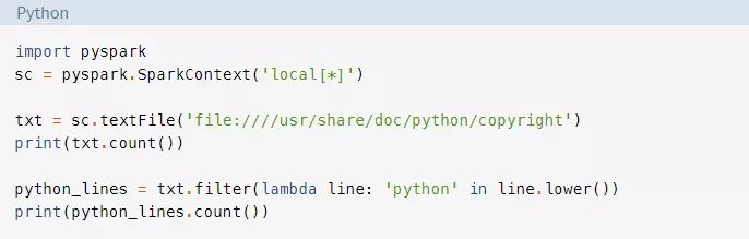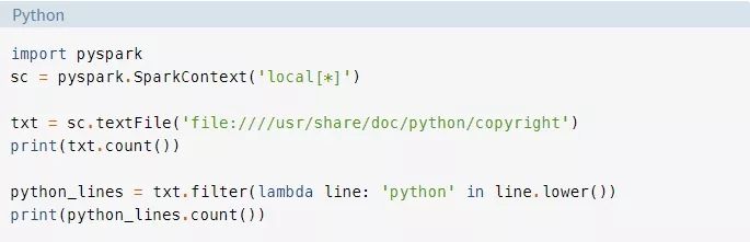在本指南中,你将只了解处理大数据的核心Spark组件。然而,所有其它组件,如机器学习、SQL等,也都可以通过PySpark在Python项目中使用。