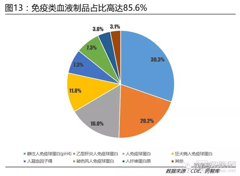 免疫类血液制品成为畅销药品:从血液制品细分产品看,免疫类血液制品占比高达85.6%,其中,静注人免疫球蛋白(pH4)销售额最高,达到30.3%。