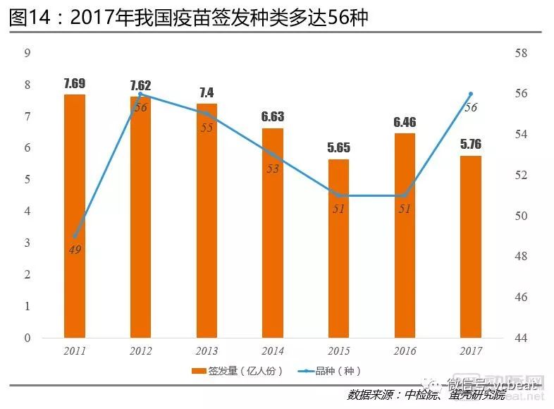 疫苗签发种类重回历史新高:2017年我国疫苗签发种类数为56种,成为既2012年后,疫苗签发数量最多的年份。