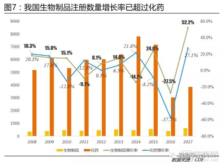 生物制品注册数量增速超过化药:根据CDE(国家药品审评中心)公布的新药注册数据,生物制品注册数量增速已经超过化药。
