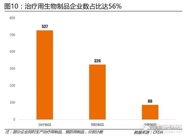 治疗用生物制品企业最多:根据各大生物制药企业生产的主要产品,治疗用生物制品企业数为527家,占企业总数的70%,单抗类和血液类成为两大主要治疗用生物制品。